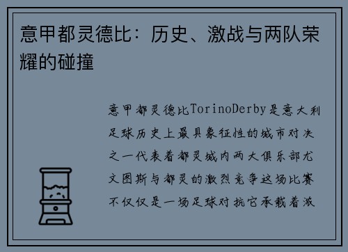 都灵德比不仅是一场简单的足球比赛,它是两队历史、文化、荣耀与激情的集中体现。尤文图斯和都灵之间的