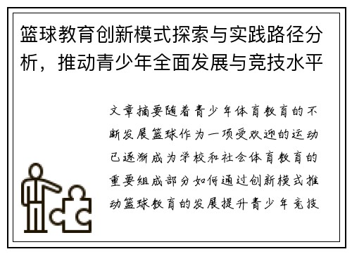 文章摘要:随着青少年体育教育的不断发展,篮球作为一项受欢迎的运动,已逐渐成为学校和社会体育教育的重要组成部分。如何通过创新模式推动篮球教育的发展,提升青少年竞技水平,并促进其全面发展,已成为当前篮球教育改革的核心议题。本文从四个方面探讨了篮球教育创新模式的探索与实践路径,包括培养多维度篮球教育的思维方式、建立科学合理的训练体系、加强心理素质训练与文化教育的融合以及重视社区与家庭合作等方面。通过这些探索,旨在推动青少年在篮球技能上的提升,同时注重其身心健康、团队精神及社会责任感的培养。篮球教育的创新模式不仅有助于青少年竞技水平的提高,还能促进其全面素质的发展,为未来的社会贡献更多健康、积极、富有责任感的人才。