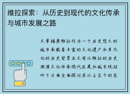 文章摘要:维拉作为一个历史悠久的城市,承载着丰富的文化遗产和多元化的历史背景。本文将从维拉的历史渊源、文化传承、现代发展和城市规划四个方面,全面探讨其从古至今的变迁与进步。通过分析维拉的文化根基、传承机制、现代化进程以及如何应对城市发展的挑战,我们不仅能够深入了解这座城市的独特魅力,还能感受到其在不断变化中的持久生命力。无论是在历史遗址的保护、传统文化的创新,还是城市空间的现代化建设,维拉都在不断探索、调整和前行,呈现出一个动态发展的城市景象。本文将重点探讨这座城市如何在全球化与现代化浪潮中,依然保留其独特的地方文化,并实现城市的可持续发展。